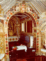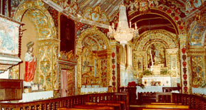 The nave has a panelled ceiling made of cedar wood, which was used in all decoration, that´ s the reason why this church has the nice aroma of this tree so characteristic of the local vegetation. Among the decorative paintings, three magnificent medallions show the figures of saint Barbara, the Holy Spirit, symbolised by a white dove and St. George killing the dragon.