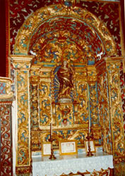 Decorated with strange human figures dressed in red and blue, the altar of our Lady of Conception, Patron Saint of Portugal, has a Pelican on the top of the wooden retable. An old legend says this bird used to give its own flesh for its young to eat. That’s why the Christian tradition adopted the Pelican as symbol of Eucharist. Whose sacrarium in this altar is decorated with angels. Also the scallop shell, everywhere in the decoration, used as a flag by men travelling in Pilgrimages, Crusades and Discoveries, symbolises the search of the way, the Hope to enter Paradise.